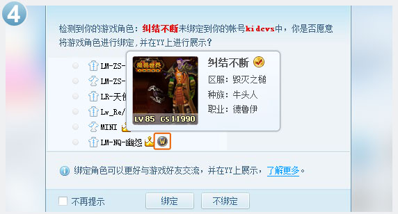4.正常退出游戏后,根据弹出的绑定界面进行绑定,成功后即可在YY频道中展示游戏信息。